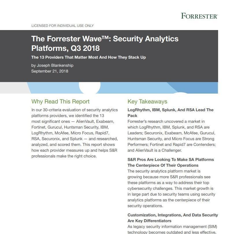 QRadar SIEM Security Intelligence Platform is recognized as a Leader for the 10th consecutive year in the latest Forrester comparison report "Wave on Security Analytics". IBM has made many significant enhancements to QRadar over the years, outpacing its competitors in the SIEM security information and event management market place, particularly innovative features that enable companies to accurately and quickly address new threats, if not effortlessly. In its review, Forrester compared AlienVault, Exabeam, Fortinet, Gurucul, Huntsman Security, IBM QRadar, LogRhythm, McAfee, Micro Focus, Rapid7, RSA, Securonix, and Splunk.